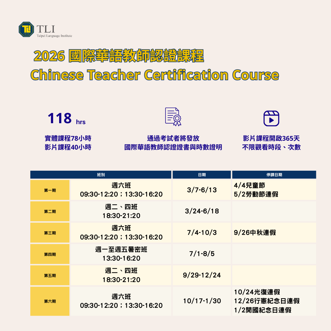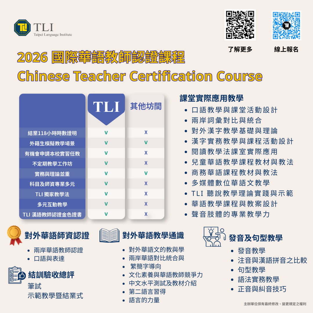 📚 TLI華語資培訓的課程內容,由專業資深講師提出並規劃,深入授課均經驗豐富、身經百戰。 118小時初步訓練、講課專業知識、兒童少、商務、文化、多媒體數字、教案設計等,培養多方面的對外漢語/對外華語教學能力。