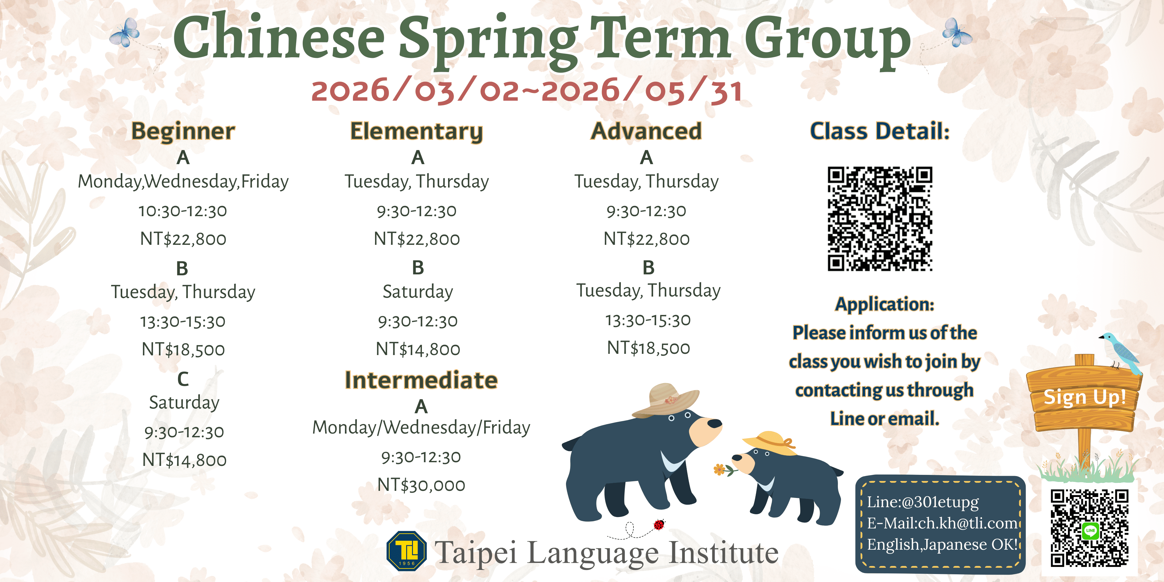 报名方法:请用LINE或email告知我们您想参加的班级。