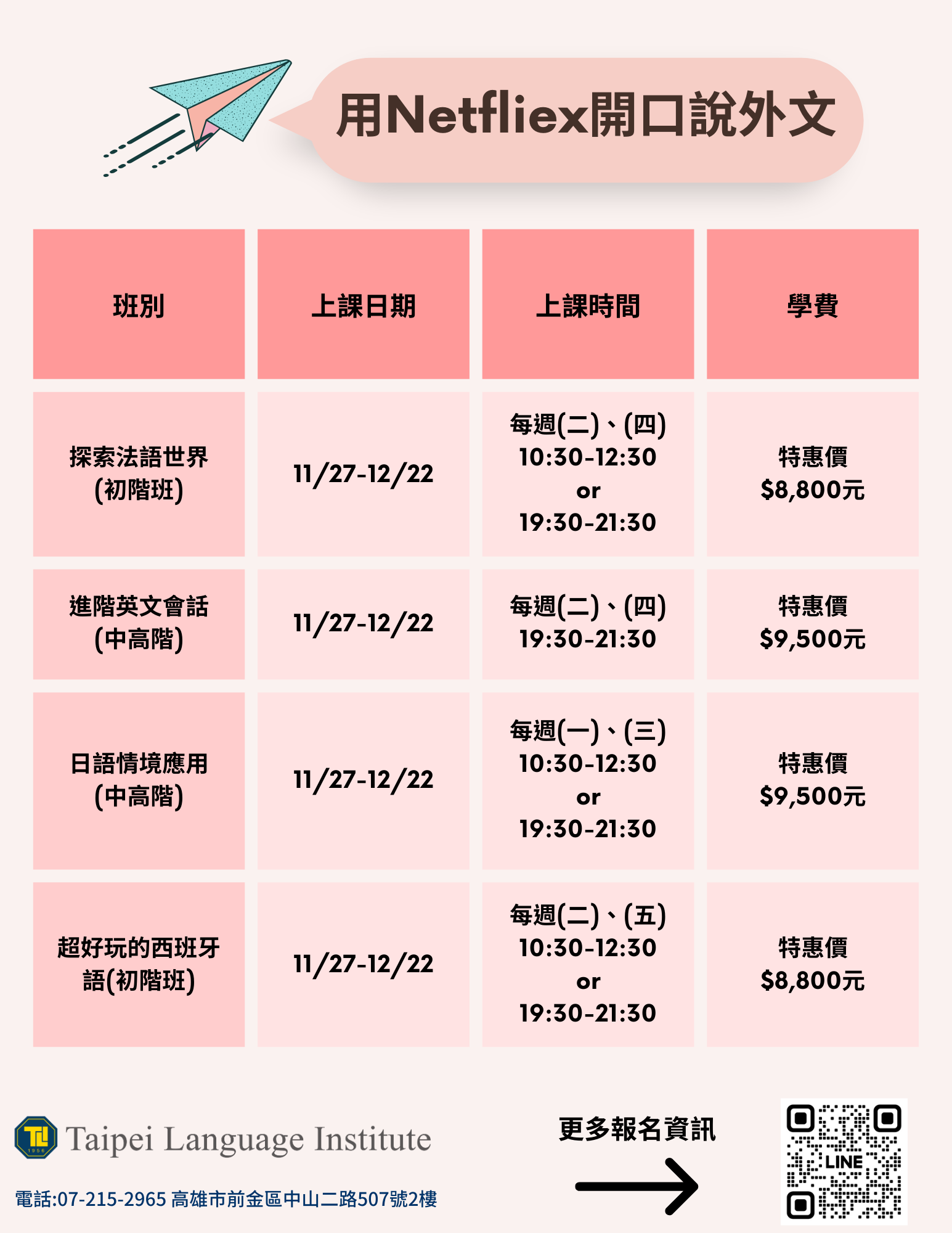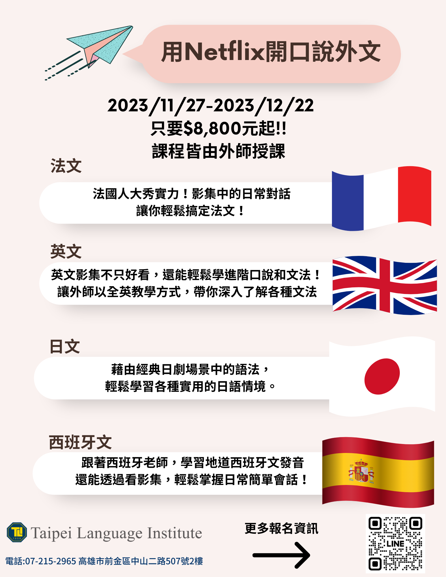 透過 Netflix 讓學生開口說外文,搭配外師的教學讓學生們學到最道地的外文。歡迎透過 Line 或是 Email 來註冊加入!LINE: https://lin.ee/cB1Lyfw